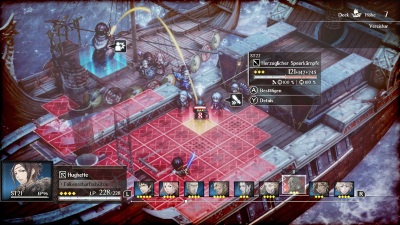 Selbiges gilt auch für die Beschaffenheit der Schlachtfelder. Wenden wir etwa einen Blitzzauber auf eine Pfütze an, erleiden sämtliche Figuren, die in dieser stehen Schaden – auch unsere eigenen. Mittels Eiszauber können wir Böden gefrieren und somit Bewegungen verlangsamen. Auch hier ist taktisches Vorgehen sinnvoll. Zusätzlich können wir Feinden mit einem Angriff mehrfach Schaden zufügen, wenn zwei Charaktere richtig platziert sind. Greifen wir einen Feind von hinten an und gegenüber steht einer unserer Verbündeten, darf dieser ebenfalls zuschlagen. Natürlich funktioniert das auch gegen uns, weshalb wir darauf achten sollten, uns nicht einkreisen zu lassen.