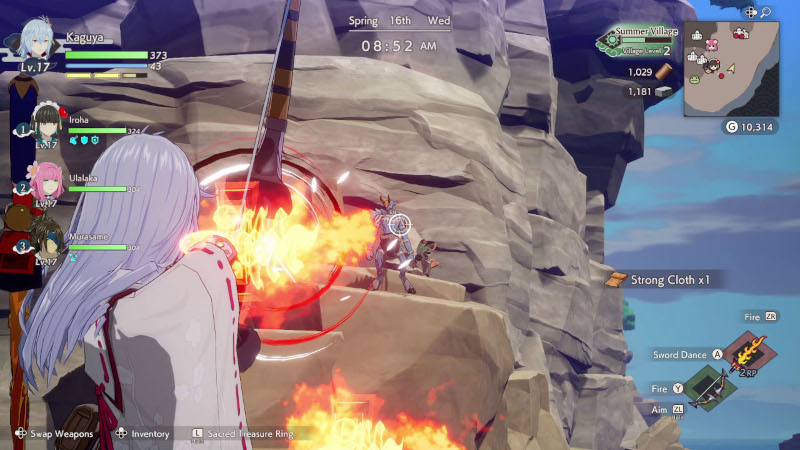 Hier zeigt sich eine der großen Veränderungen im Vergleich zu den Vorgängern, besonders zum schlauchartigen Rune Factory 5. Außerhalb der Dörfer wartet zwar keine Open World, dafür aber weitläufige Gebiete darauf erkundet zu werden. Zahlreiche Geheimnisse wie Ruinen mit Schätzen sollen dazu verleiten, sich genau umzusehen. Zudem warten verschiedene Dungeons auf die Heldengruppe. Denn Subaru beziehungsweise Kaguya ist nicht alleine unterwegs. Bis zu drei Charaktere können die Hauptfigur begleiten und dienen auch als Unterstützung in den Echtzeit-Kämpfen, die auf den ersten Blick an die beiden The-Legend-of-Zelda-Spiele Breath of the Wild und Tears of the Kingdom erinnern. Mit Nahkampfwaffen wie Schwert oder Doppelklinge wird angegriffen. Neu sind magische Talismane und ein Bogen, der jederzeit verwendet werden kann. Wie sich die Begleiter auswirken, wie sich diese unterscheiden und welche Anpassungen möglich sind, muss sich noch zeigen. Allerdings soll jede Waffe der Hauptfigur eigenständig verbessert werden können.